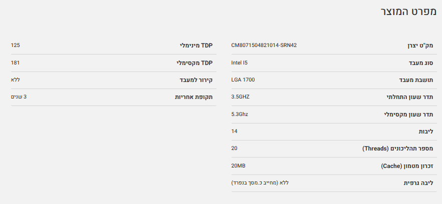 מעבד דור 14 Intel i5-14600KF Tray 14 Cores No GPU up to 5.3Ghz