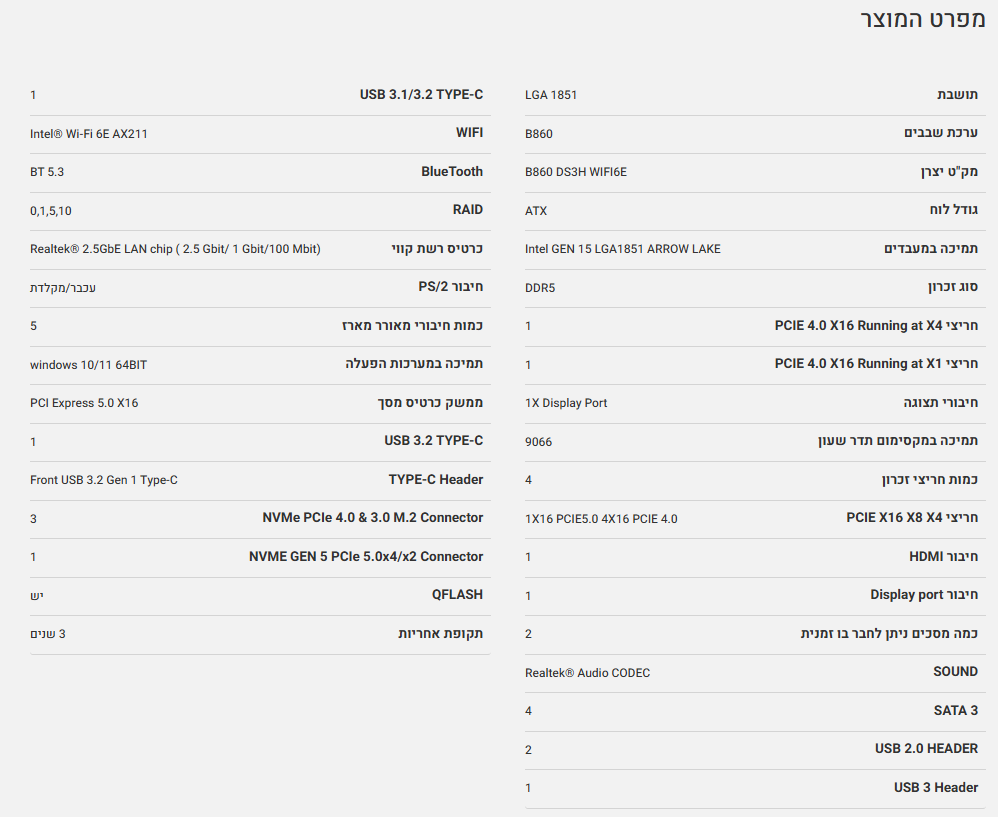 לוח למעבד דור 15 Gigabyte B860 DS3H WIFI6E ATX 2.5GB LAN