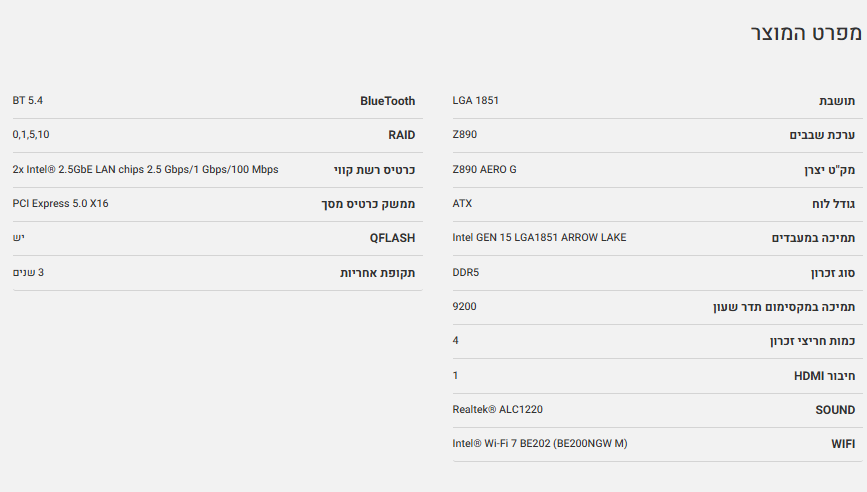 לוח לאינטל דור 15 Gigabyte Z890 AERO G DUAL 2.5 Lan 5Xm.2 TB4