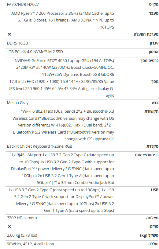 4050, זיכרון 16GB DDR5, דיסק 1TB NVMe, מסך 144Hz, טעינה מהירה, Wi-Fi 6, וללא מערכת הפעלה.