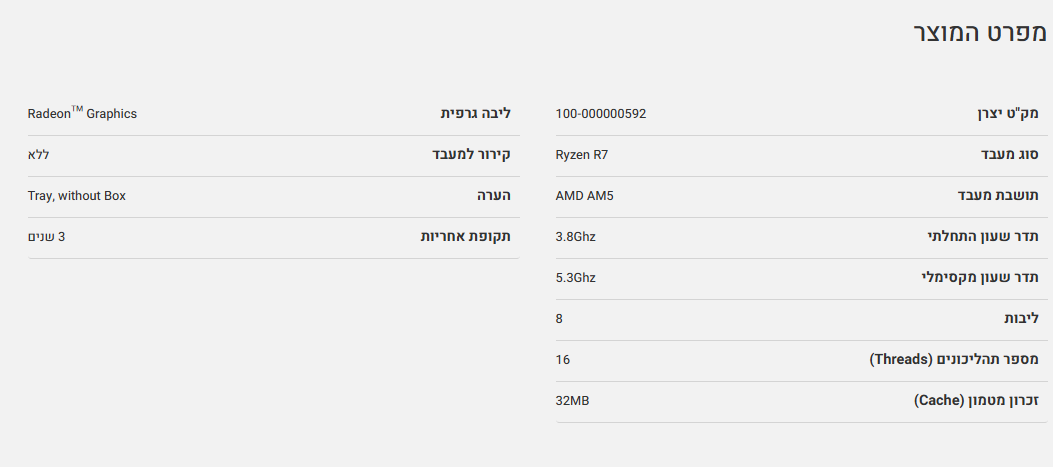 מעבד AMD Ryzen 7 7700 Tray Gaming Processor PCIE 5.0 AM5 105W TDP