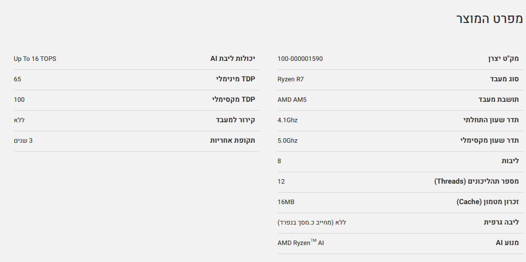 מעבד AMD Ryzen 7 8700F Zen4 8 Cores 16 Threads Up to 5 GHz