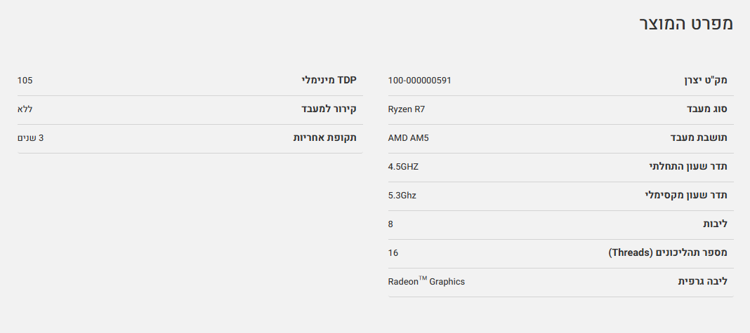 מעבד AMD ZEN4 R7 7700X Tray no Fan AM5 TDP 105W Up to 4.5Ghz 8Crs
