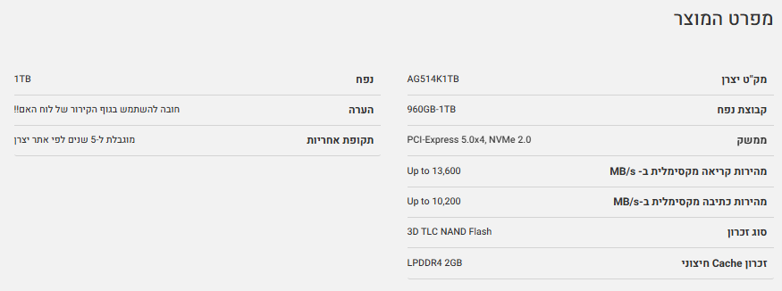 דיסק פנימי AORUS Gen5 14000 SSD1TB PCI-E 5.0X4 NVMe 2.0