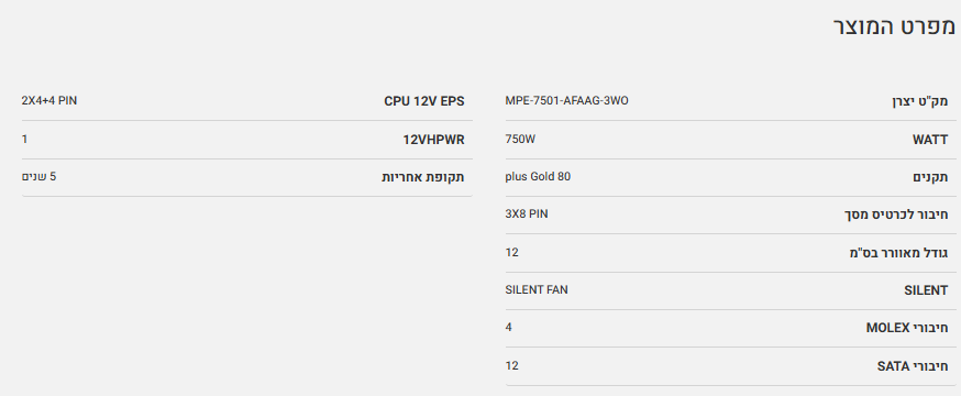 ספק כוח Cooler Master MWE 80 Plus GOLD 750W V2 ATX 3.0 READY