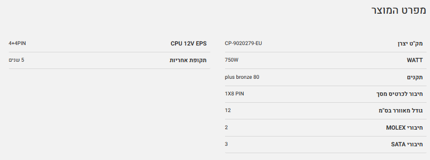 ספק CORASIR CX750 Non modular750W 80 Plus Bronz PSU