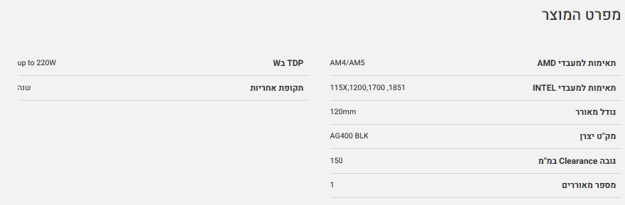 קירור אוויר למעבד DeepCool AG400 Black ARGB 220W TDP 150mm