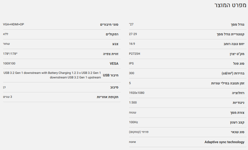 מסך Dell P2725H FHD IPS Pivot 100Hz 5ms USB 3.2 Hub VGA DP HDMI