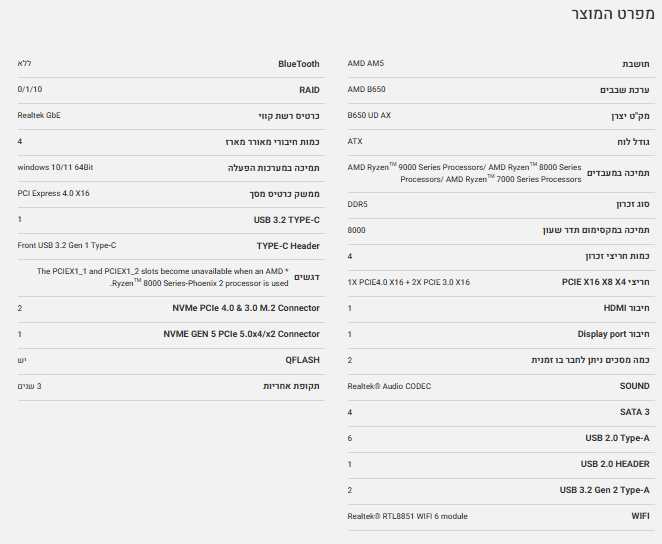 לוח אם Gigabyte B650 UD AX AMD AM5 Wifi 6 PCIE 5.0 DDR5
