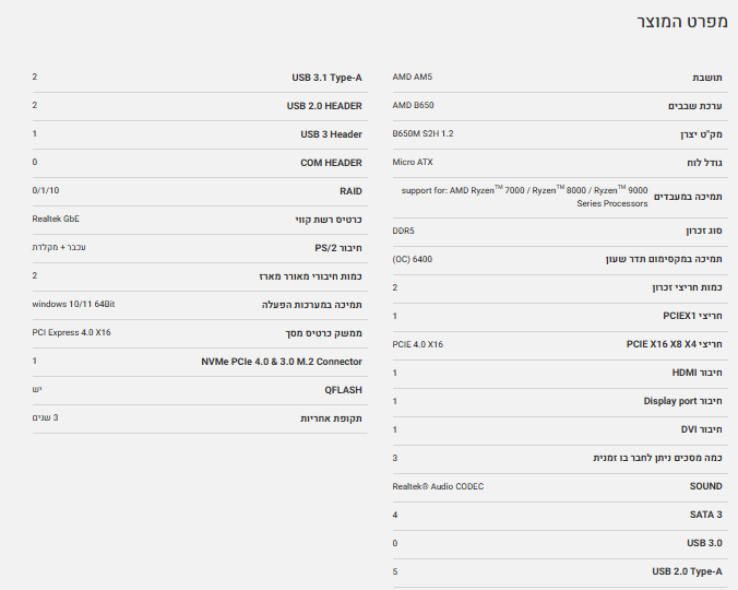 לוח Gigabyte B650M S2H 1.2 AM5 Micro-Atx DDR5 DP HDMI AMD