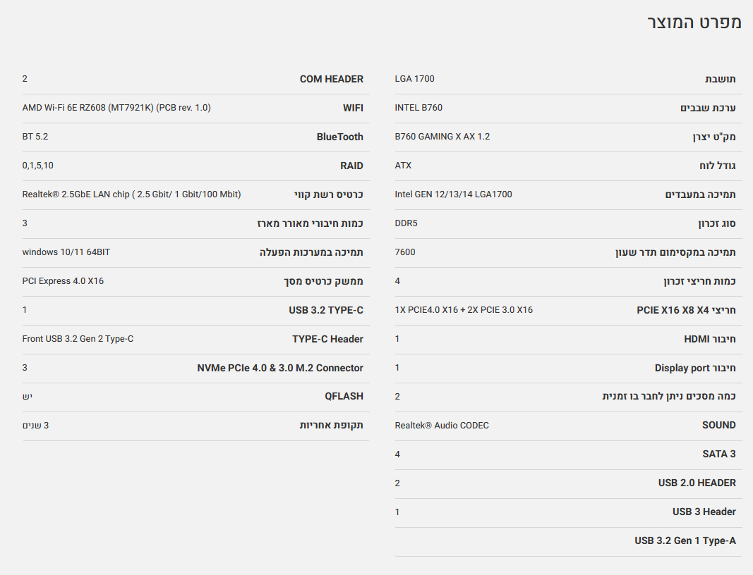לוח למעבדי אינטל Gigabyte B760 Gaming X AX 1.2 DDR5 ATX WIFI6