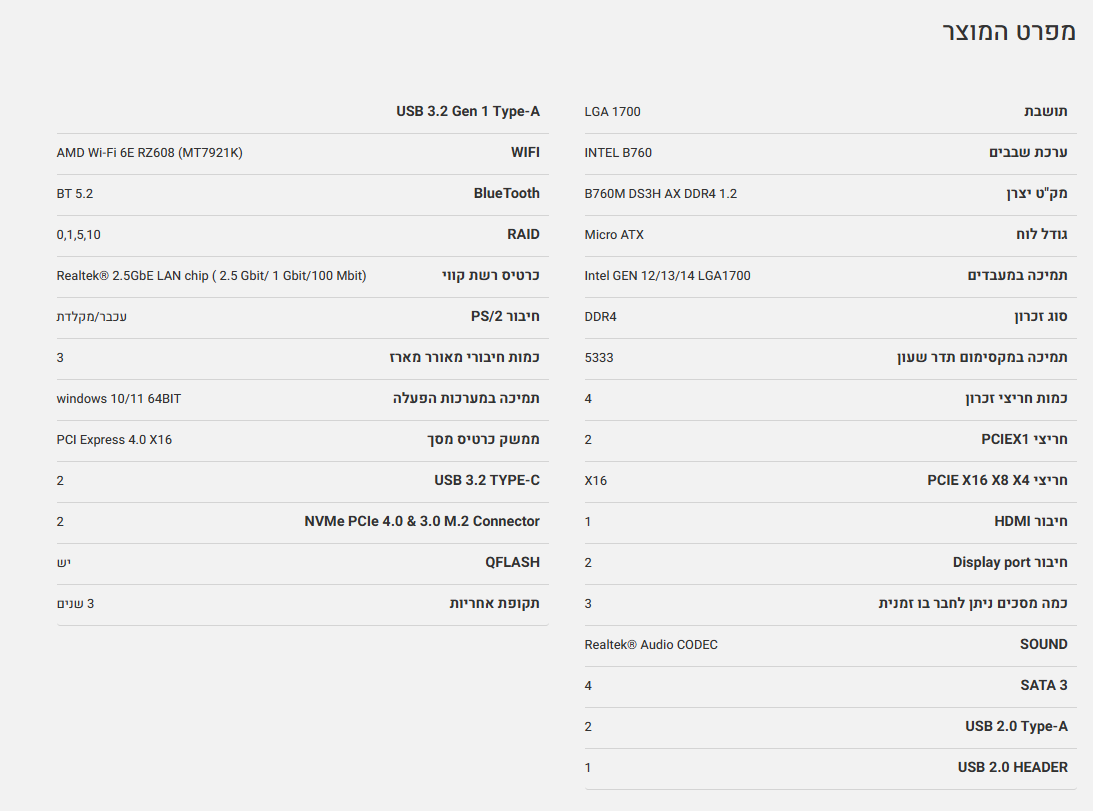 לוח Gigabyte B760M DS3H AX DDR4 1.2 Micro-ATX WIFI6 LGA1700