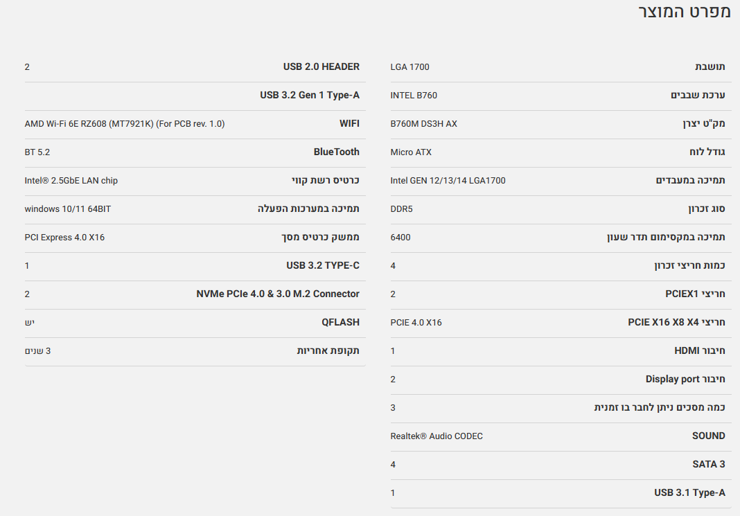 לוח Gigabyte B760M DS3H AX DDR5 Micro-ATX WIFI6 LGA1700
