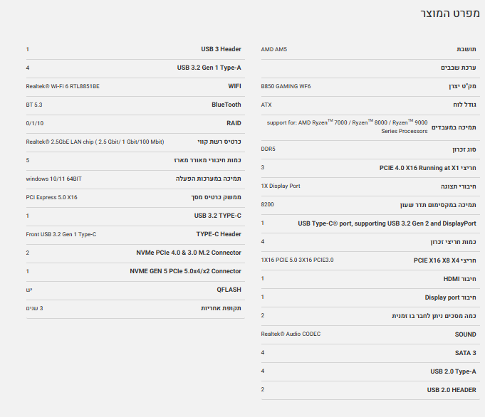 לוח אם GIGABYTE B850 GAMING WIFI 6 ATX DDR5 AM5 BT 2.5GBE LAN