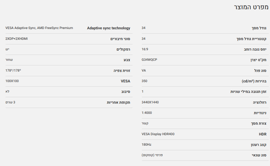 מסך קעור Gigabyte G34WQCP Gaming Monitor 3440X1440 1Ms VA 180Hz
