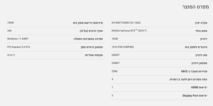 כרטיס מסך GIGABYTE GeForce RTX 5070 Ti AERO OC 16G