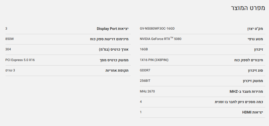 כ.מסך GIGABYTE GeForce RTX 5080 WINDFORCE OC SFF 16G