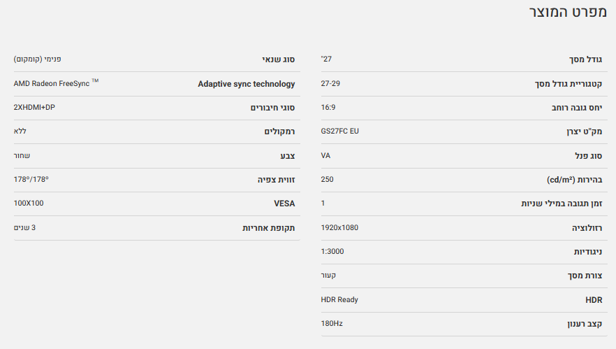 מסך גיימינג קעור Gigabyte GS27FC FHD VA 1MS HDR Ready 180Hz