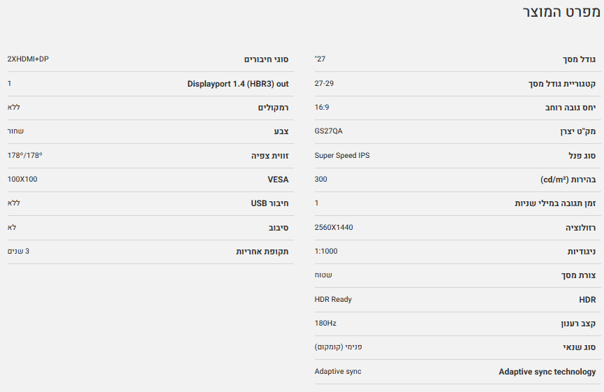 מסך גיימינג Gigabyte GS27QA QHD SS IPS 180Hz 1MS HDR Ready