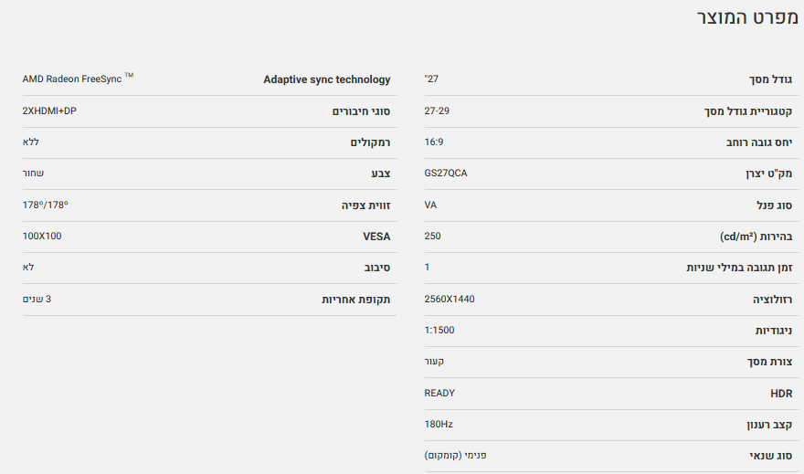 מסך קעור Gigabyte GS27QCA VA 180hz QHD HDR Ready AMD FreeSync