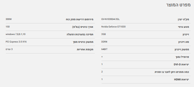 כרטיס מסך Gigabyte GT 1030 2GB DDR4 DVI HDMI Low Profile