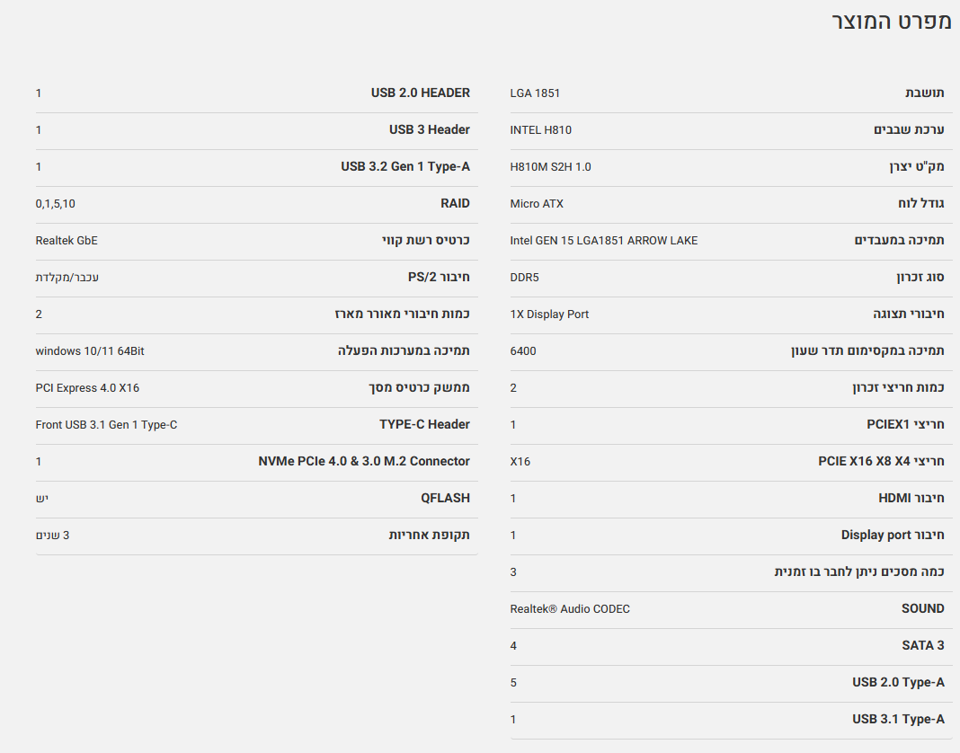 לוח Gigabyte H810M S2H 1.0 Micro-Atx DDR5 LGA1851 VGA HDMI