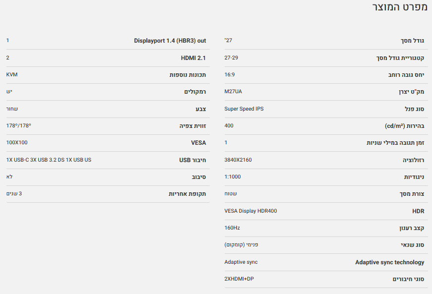 מסך גיימינג Gigabyte M27UA 4K SS IPS 160Hz 1MS HDR USB HUB