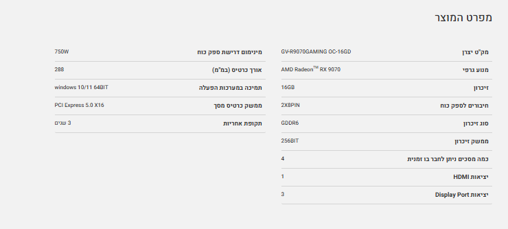 כרטיס מסך Gigabyte RADEON RX9070 GAMING OC 16GB PCIE 5.0