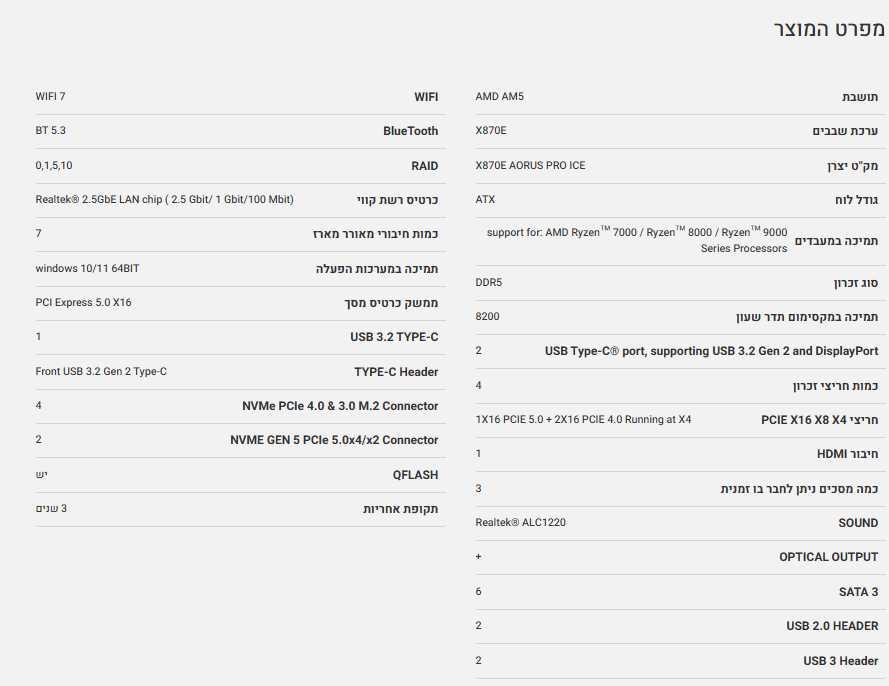 לוח אם GIGABYTE X870E AORUS PRO ICE ATX DDR5 WIFI7 AM5 2.5GBE LAN