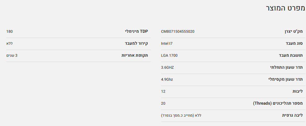 מעבד דור Intel Core i7-12700F Tray No Gpu up to 4.90 GHZ 12