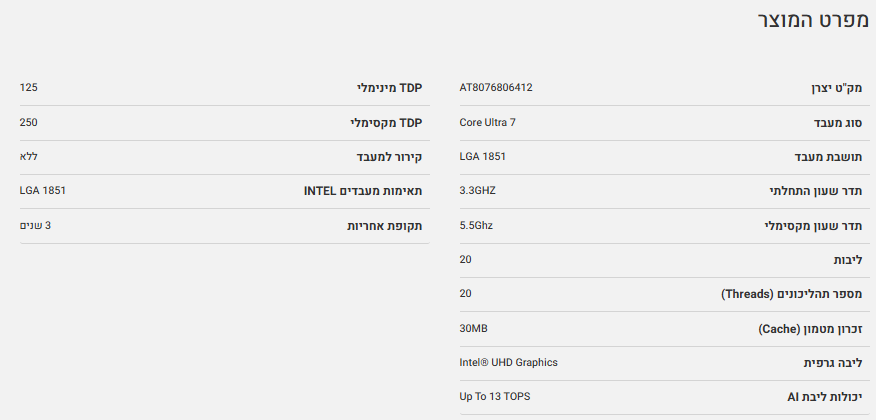 מעבד Intel Core Ultra 7 265K Tray Up To 5.5GHz NPU LGA 1851