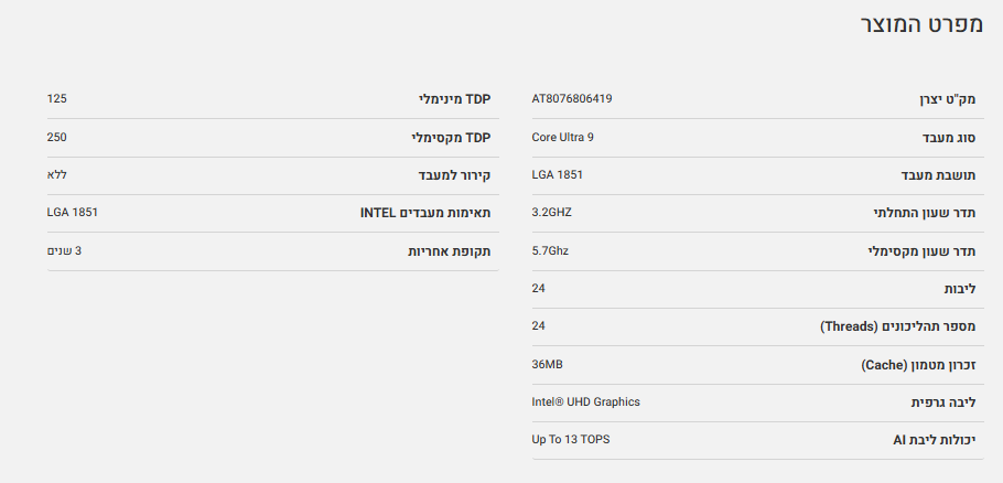 מעבד Intel Core Ultra 9 285K Tray Up To 5.7GHz NPU LGA 1851