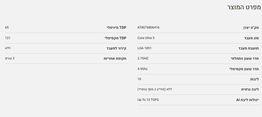 מעבד Intel Ultra 5 225F Tray No GPU Up to 4.9Ghz AI BOOST 13TOPS