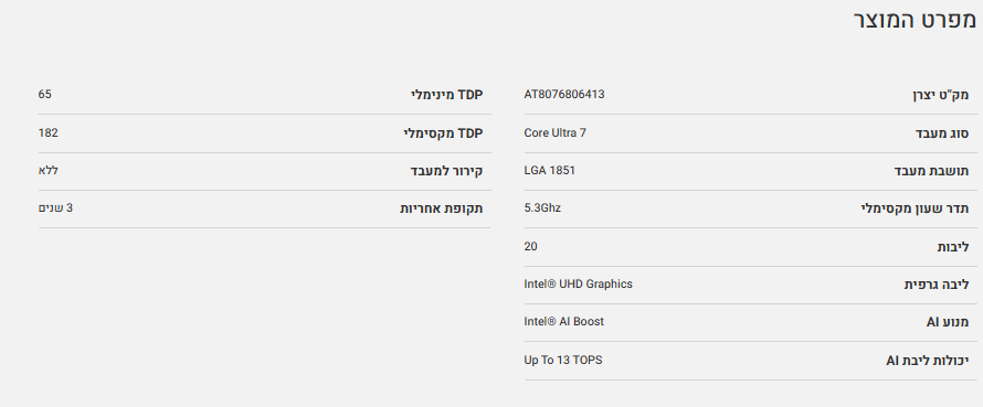 מעבד אינטל Intel Ultra 7 265 Tray no fan intel UHD GPU LGA 1851