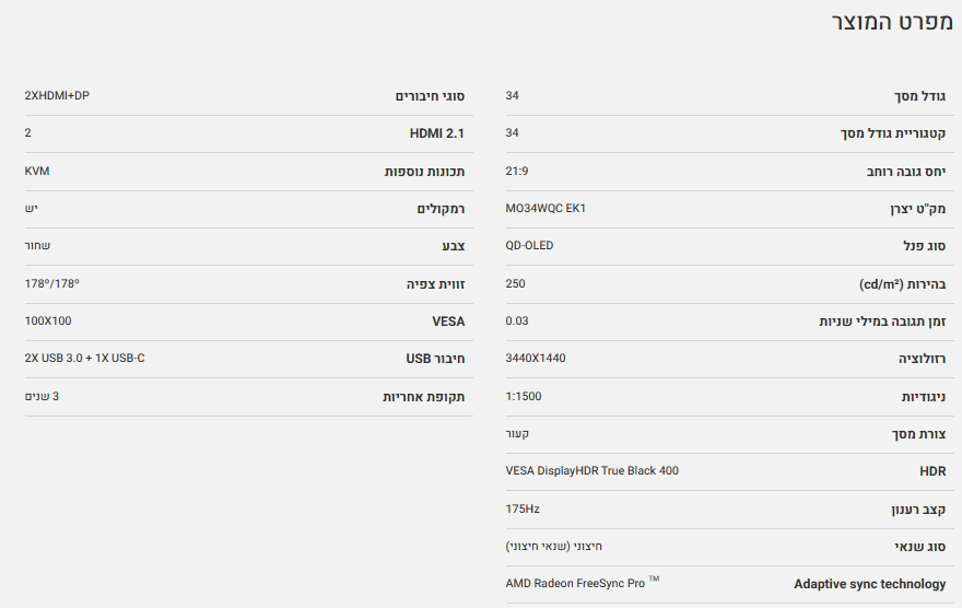 מסך קעור QD-OLED 0.03ms 175Hz "GIGABYTE MO34WQC Curved 2K WQHD 34