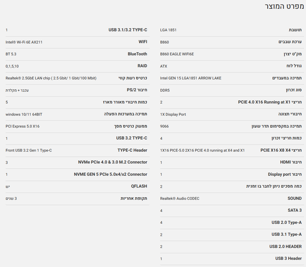 לוח למעבד דור 15 Gigabyte B860 EAGLE WIFI6E ATX 2.5GB LAN