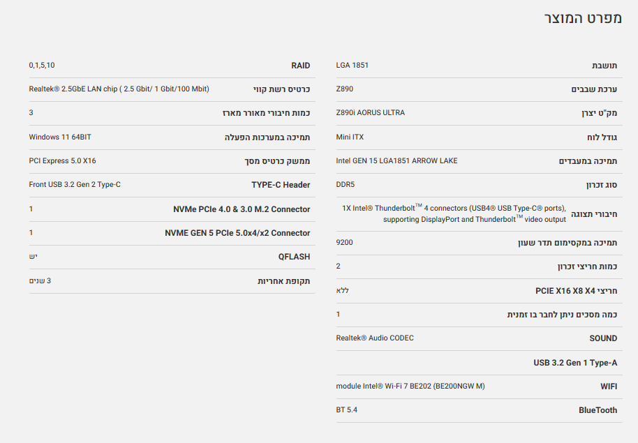 לוח דור 15 Gigabyte Z890i AORUS ULTRA Mini-ITX WiFi7 LGA1851