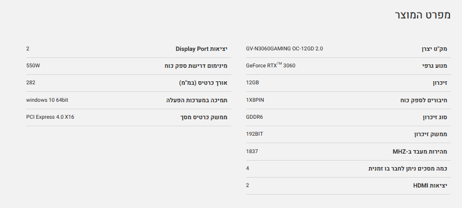 כ. מסך Gigabyte RTX3060 Gaming OC 12GD 2.0 PCIE4.0 LHR