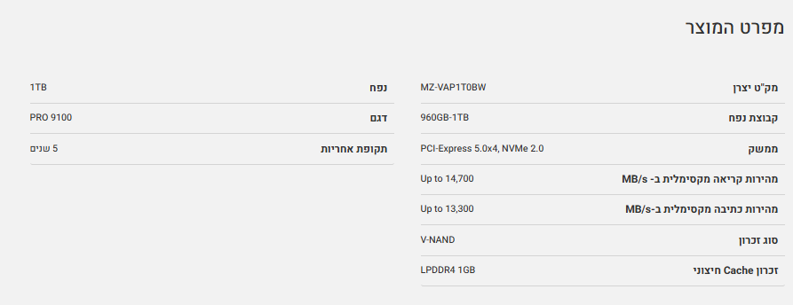דיסק פנימי Samsung 9100 PRO 1TB Gen5 M.2 NVME 2.0 14700/13300 RW